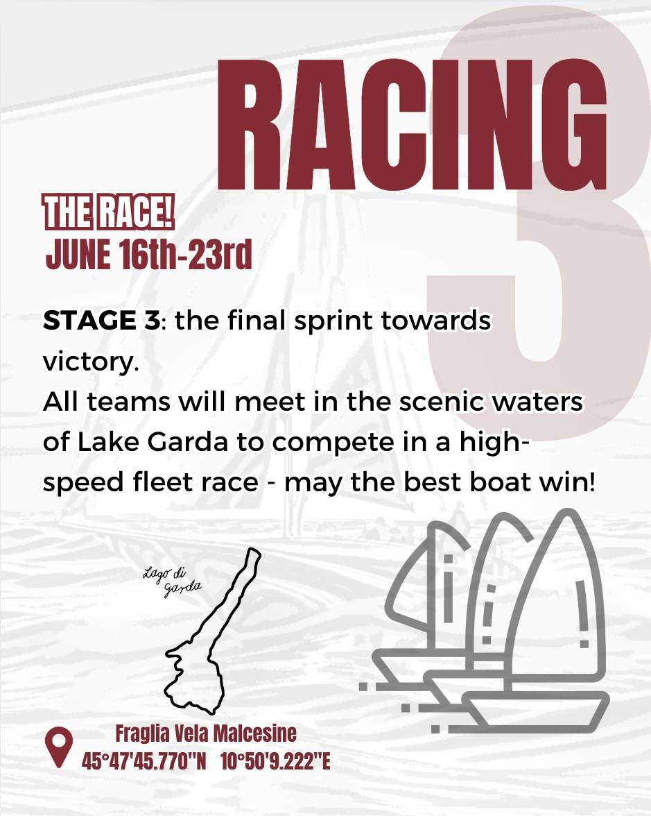 - Fase 3 - Regata finale: le squadre si incontreranno nelle spettacolari acque del Lago di Garda, per competere in una regata di flotta alla massima velocità. Che vinca la barca migliore!